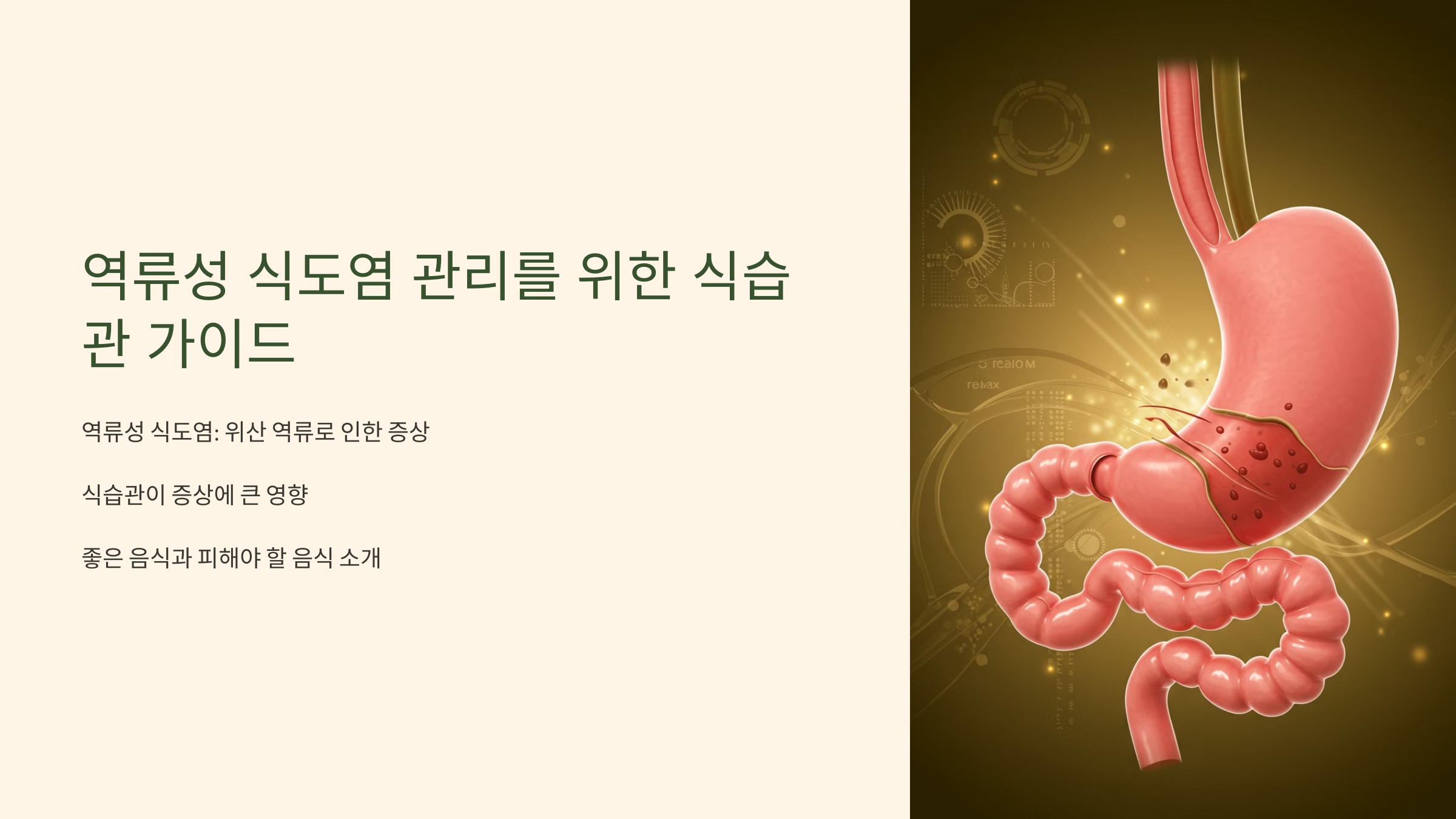 역류성 식도염은 위산이 식도로 역류하면서 가슴 쓰림, 속 쓰림, 목 이물감 등의 증상을 유발하는 질환입니다. 특히, 잘못된 식습관이 증상을 악화시키거나 완화하는 데 큰 영향을 미칠 수 있습니다. 그렇다면 역류성 식도염 환자에게 좋은 음식과 피해야 할 음식에는 어떤 것들이 있을까요? 이번 글에서는 역류성 식도염 증상을 줄이고 위 건강을 지키는 데 도움이 되는 음식과 반드시 피해야 할 음식에 대해 자세히 알아보겠습니다.