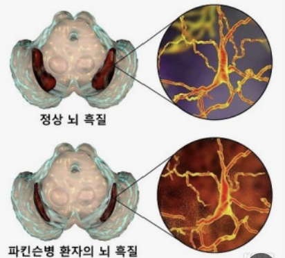 뇌의 기저핵이라는 부위에서 도파민이 부족해지면서 운동 조절이 어려워지고, 파킨슨병 증상이 나타납니다.